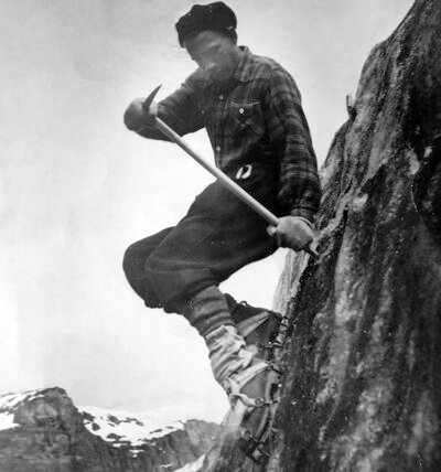 Carlos Sonntag en 1954, dictando un curso de escalada en hielo en el Ventisquero Negro del Tronador.